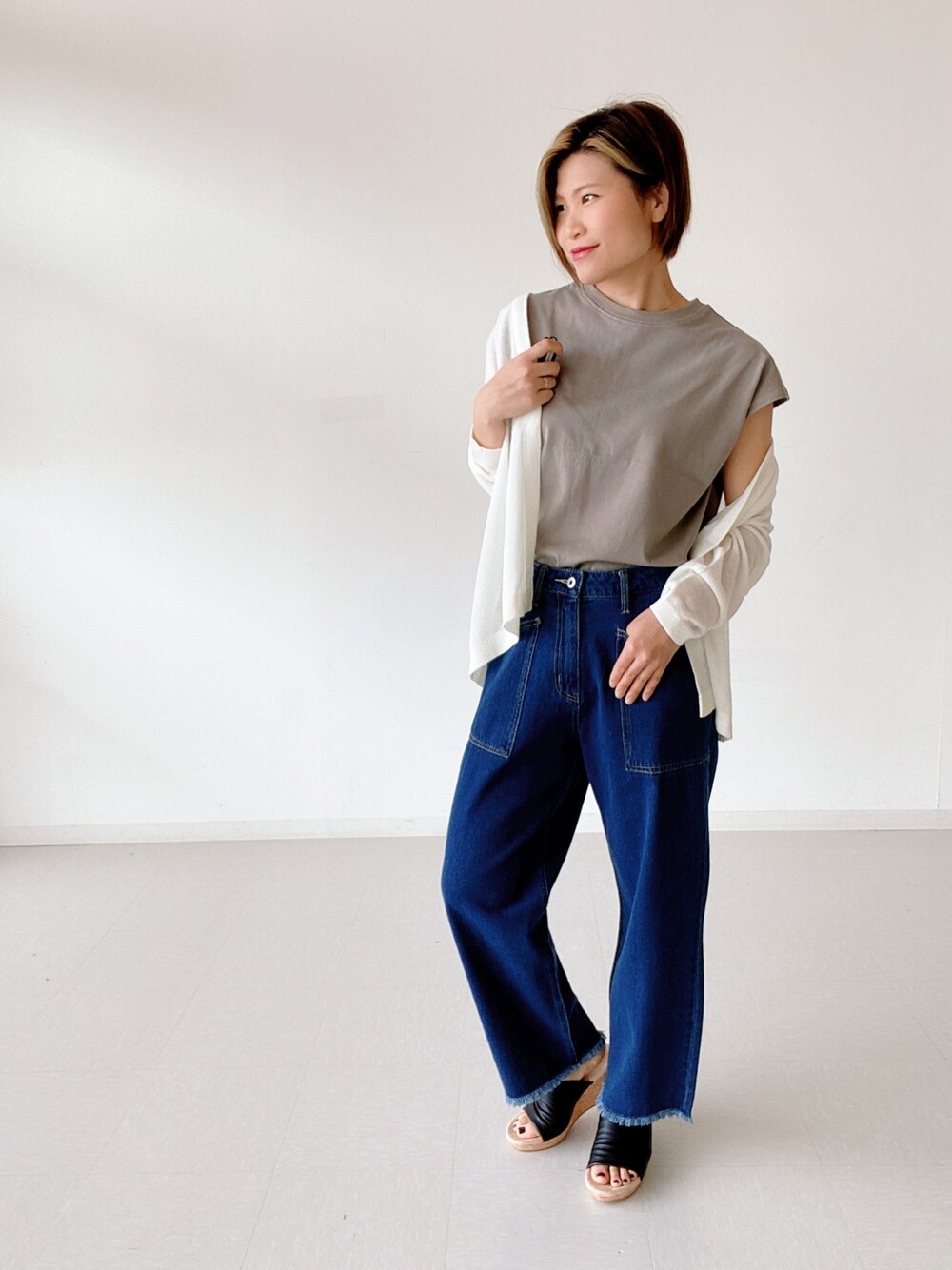 ご覧いただきありがとうございます! 雨で寒かった日に☂️ フレンチスリーブのTシャツにカーディガンを合わせて。 ドライタッチのカーデ、サラっと着られてこれからの季節に嬉しい一枚。