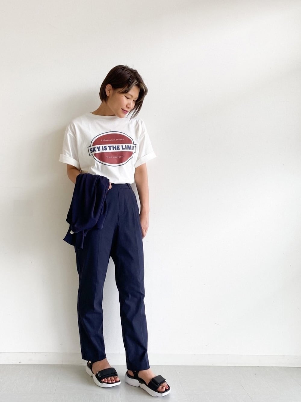 ご覧いただきありがとうございます! 赤×ネイビーはやはり最強! ロゴTにテーパードパンツを合わせて大人カジュアルに💃