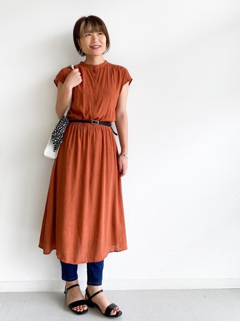 ご覧いただきありがとうございます! きれいめバンドカラーワンピにデニムを合わせてカジュアルダウン🍊 デニムは丈が短めなので、足元をスッキリ見せてくれます。