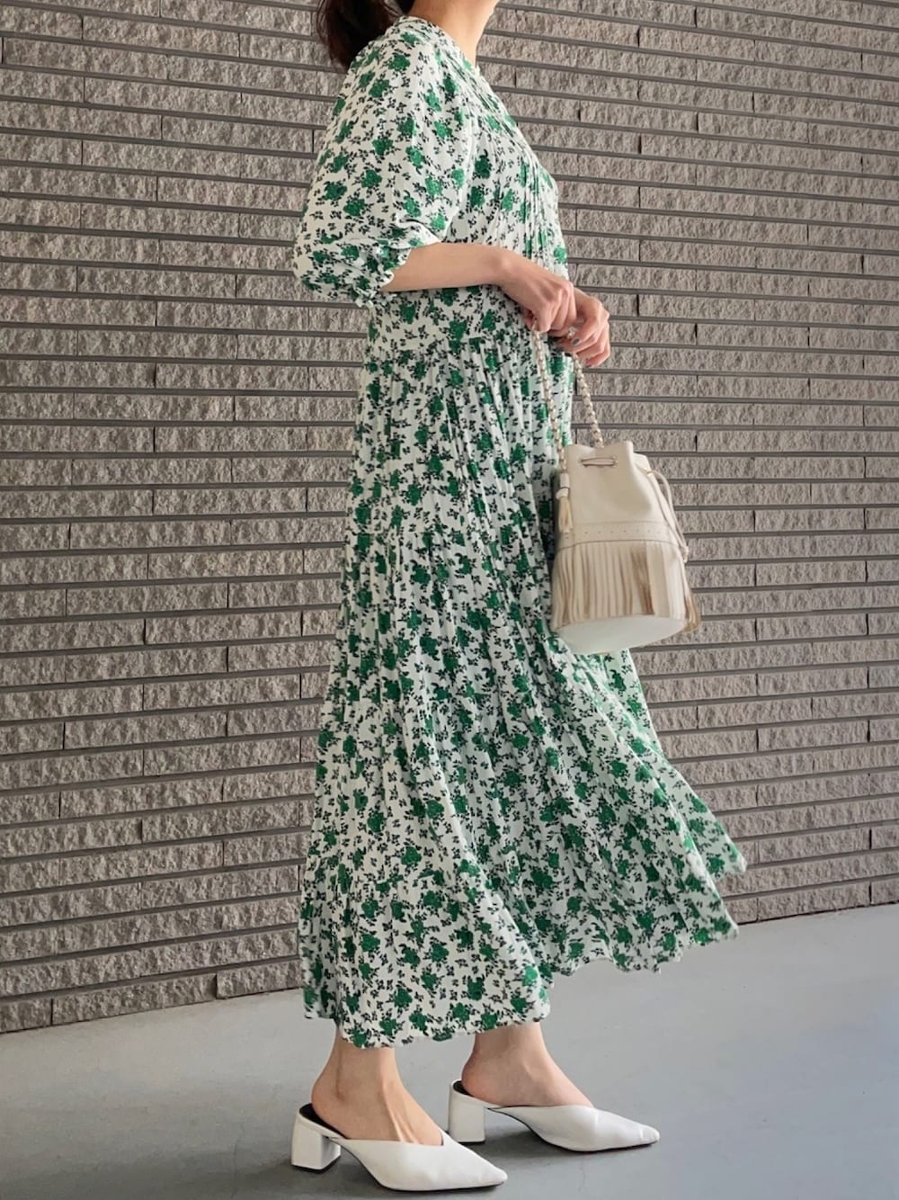 晴れの日はなぜか緑が着たくなります👗去年一目惚れして買ったZARAの花柄ワンピ。白小物を合わせてとことん春っぽく。