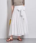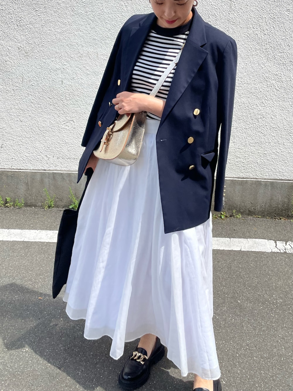白いスカートはフワッと風になびく感じがお気に入り🤍 差し色はゴールドと、リップの赤で。