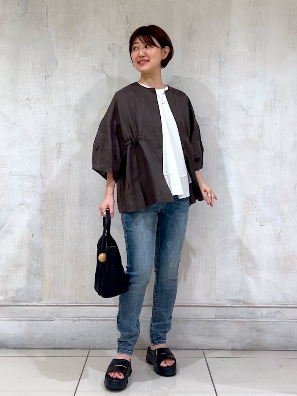 Tシャツ1枚では心許ない時に活躍する、 さらっとしたリネンの羽織。 カーディガンやシャツよりも少しきちんと、 ジャケットよりもラフに、着ていただけます。 ゆったりした作りですが、 フロントのギャザーを絞ることで裾に動きが出るので メリハリのあるシルエットに◎ デニムパギンスは1サイズを履いています。 かなり伸びが良いのでやみつきに!