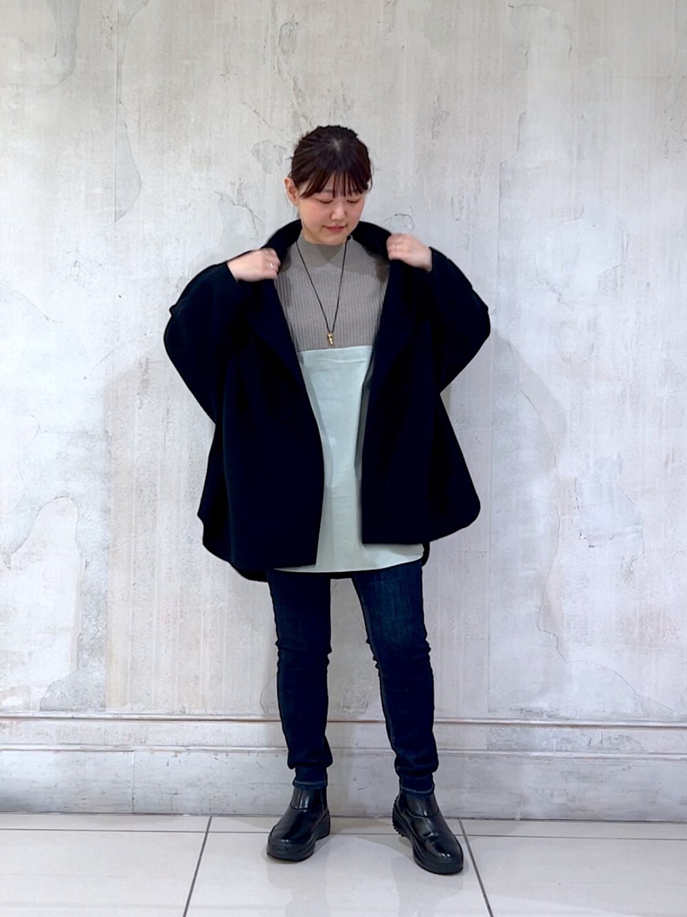 【アウター】サイズ1着用 ふっくらとした温かい厚みながらもとても軽い! 大きめな襟は広げると顔まわりスッキリ、Pコートのような感覚で着られます◎ 裏地つきなので、ニットとの摩擦も少なく着やすいです。 【トップス】 シャツとニットがバイカラーで組み合わさったトップスは 1枚でもサマになり、コーデを格上げしてくれます! 柔らかいのでアウターの中でも ゴワつきなどは気になりませんでした◎ 【ボトム】サイズ1着用 162cmで裾がほんの少しくしゅっとなる丈感になりました。 とてもよく伸び、しめつけ感もなく楽ちんで履けます◎