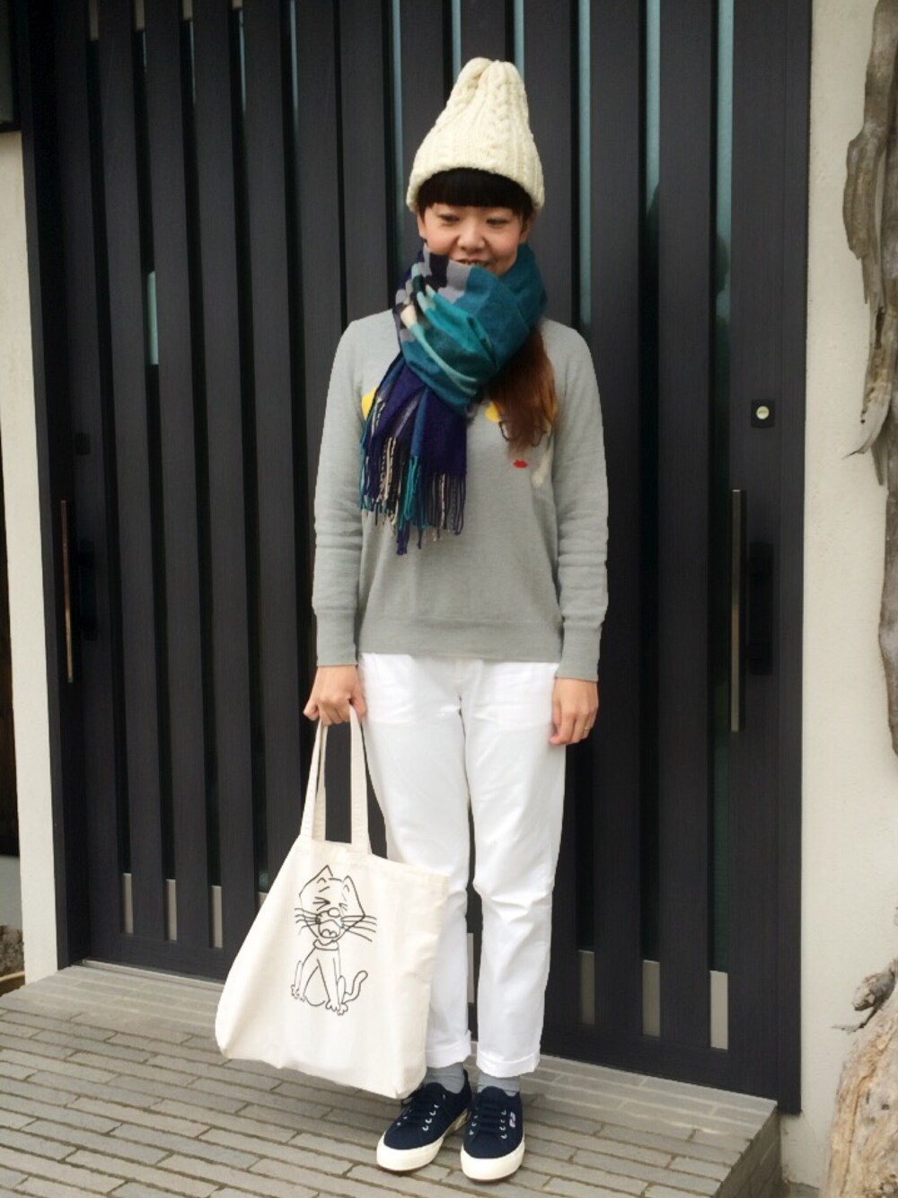 グレー×ホワイト×ネイビー シンプルコーデが好き♡ クリスマスなので、グリーンを差し色に🎄