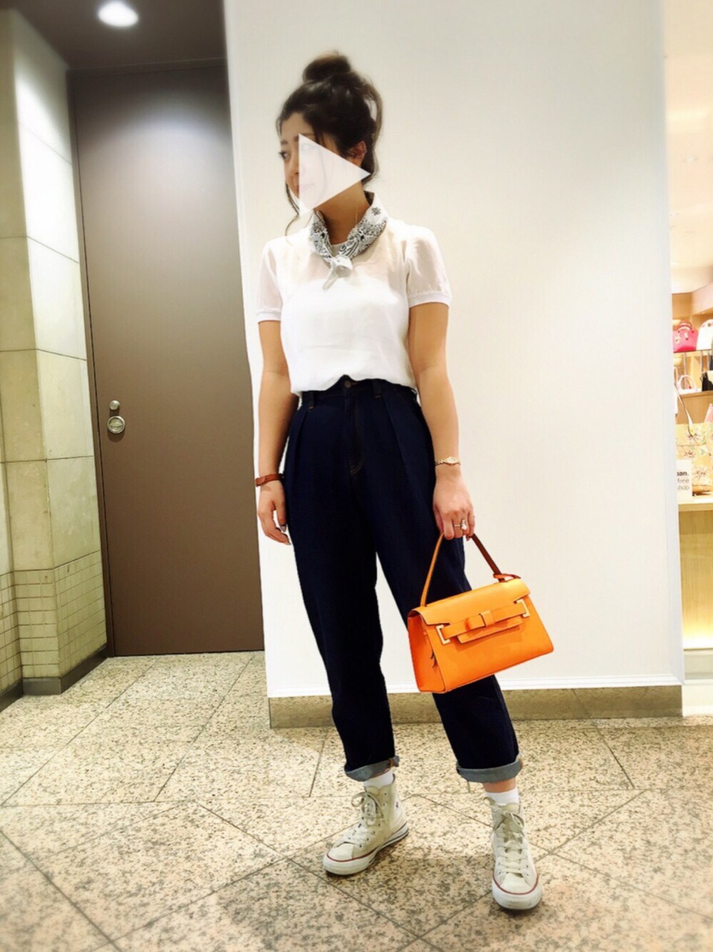 ワードローブが黒か白かデニムしかない… オレンジのMchouchouをアクセントに❣ シースルーのTシャツはアウトレットでお得でした😎