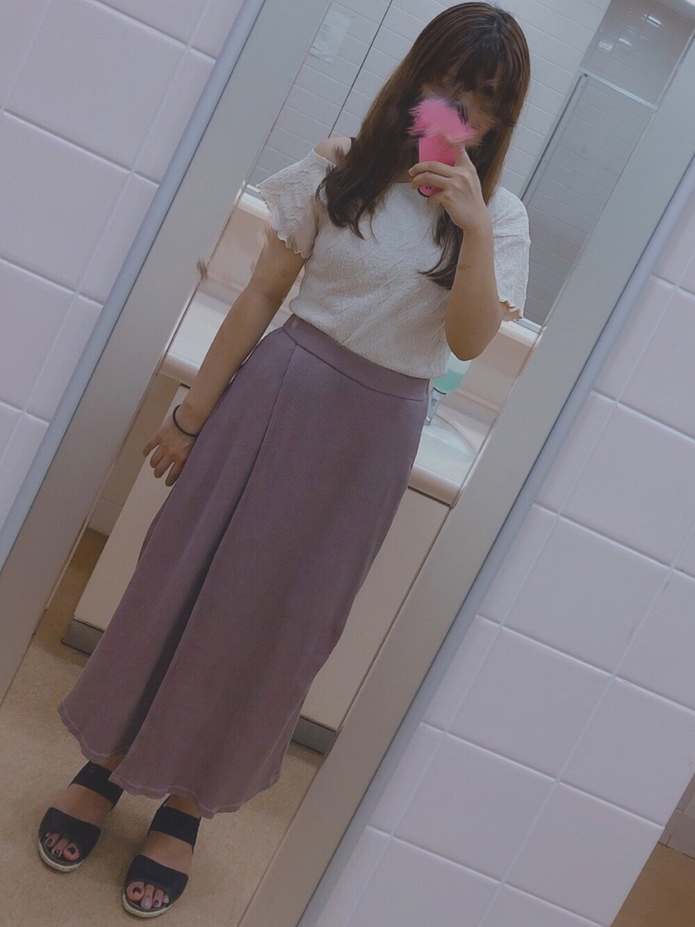 暑かったのでカスタネのワンショルダーをトップスに 淡い色で揃えて黒のスポサンで締めてみました🌻♥ 今日は全体的に可愛らしくしたかったのでワンカールだけして女の子らしく👧💓 写真撮り慣れてないから仁王立ち笑