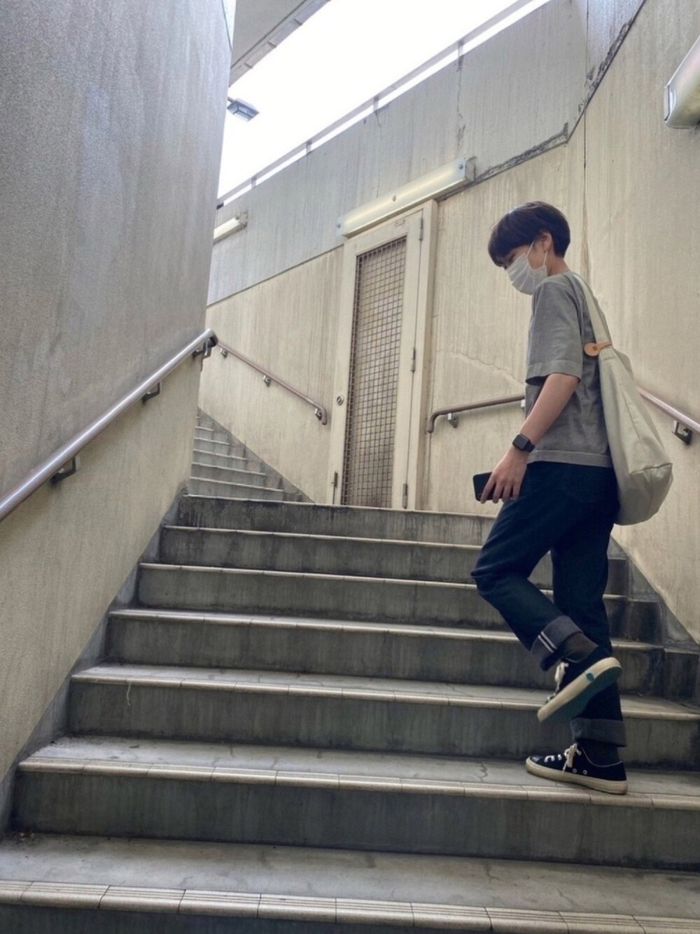 いつも行く喫茶店へ ラフな格好がいちばん! TASINAMIとkanocoさんのコラボバッグ お気に入りです。