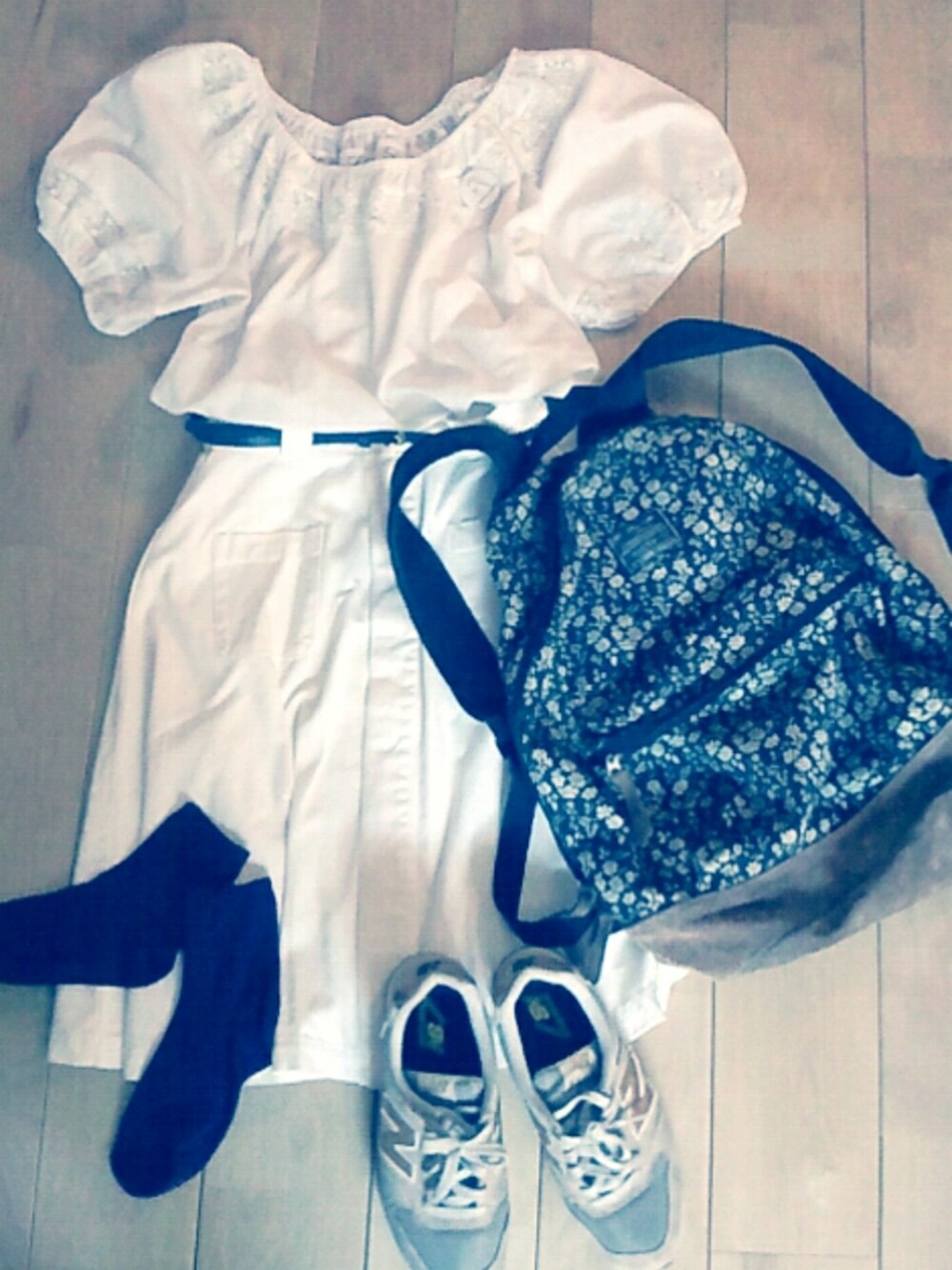お気に入りの白ブラウスです! インナーとしても使えるので ワンピのしたにきたりして 万能さんです!:-O かみは両サイドでゆるくねじりました くつしたは色がわかりづらいけど エンジですよ:-) 白ブラウス ...古着 スカート ...レイカズン ベルト ...不詳 リュック ...不詳 くつした ...チュチュアンナ くつ ...NEW BALANCE カンバッジ ...ノベルティー