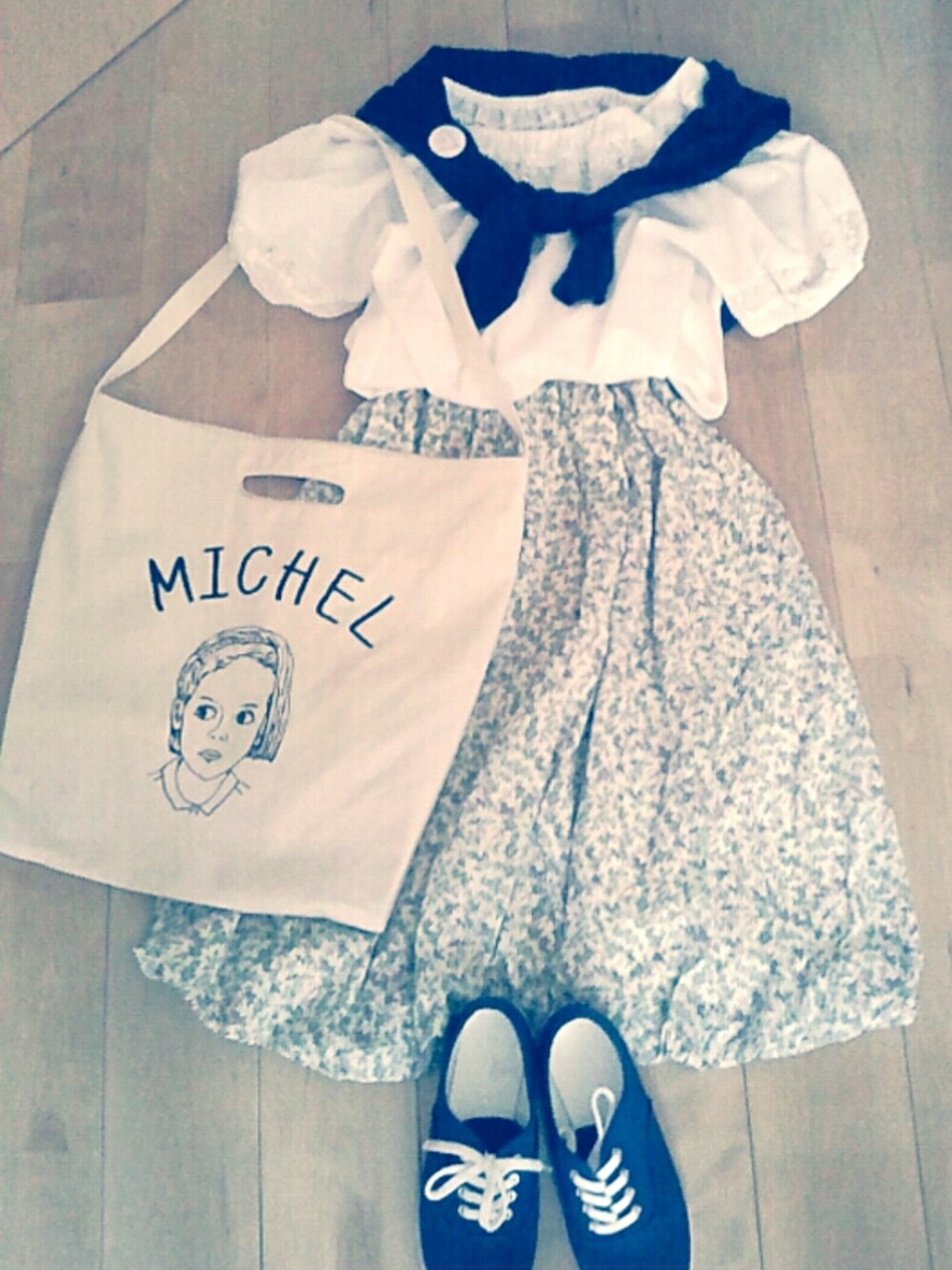 ちょっぴり暖かくなってきたので半袖です でも一応カーディガンもってきますw くつしたとるのわすれたw 私てきにはロングスカートのときは 透けソックスはくのが好きです 髪は両サイドでネジネジして 赤パッチンでとめる予定w 明日は体育祭の幹部たちの集まりですー (みどり連合だからスカートも緑?) うん楽しみだなぁ:-) ブラウス 古着 スカート ビームスボーイ カーディガン レイカズン スニーカー ジーユー くつした Tabio トート リベット&サージ 赤パッチン 百均のー カンバッジ ノベルティー