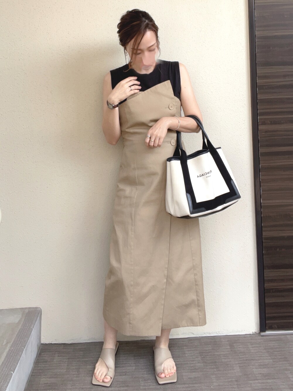 mocoのトートバッグ「Balenciaga - Cabas Leather-trimmed Canvas Tote - Cream」を使ったコーディネート