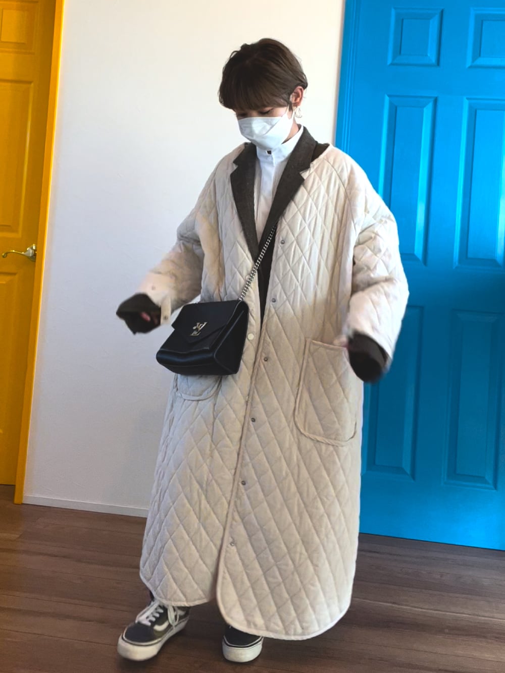 mocomoco224のノーカラーコート「コットンキルティングロングコート」を使ったコーディネート