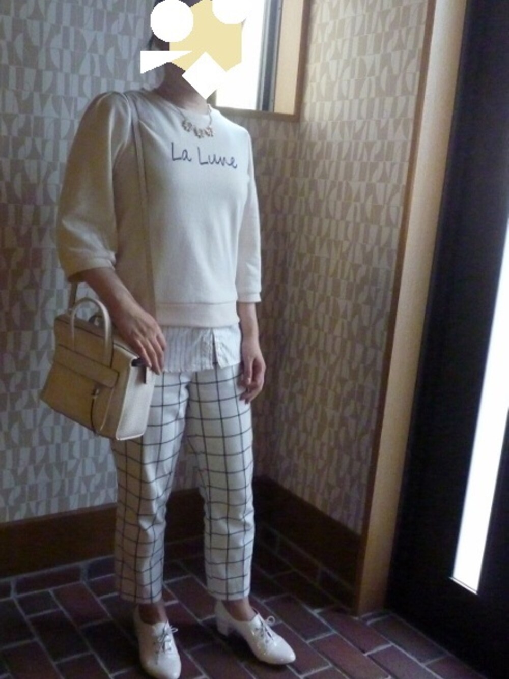 <白ロゴカットッソー:コーデ1> 白のワントーンコーデでまとめました。 タンクトップのストライプ柄、ズボンのチェック柄で メリハリをつけています。