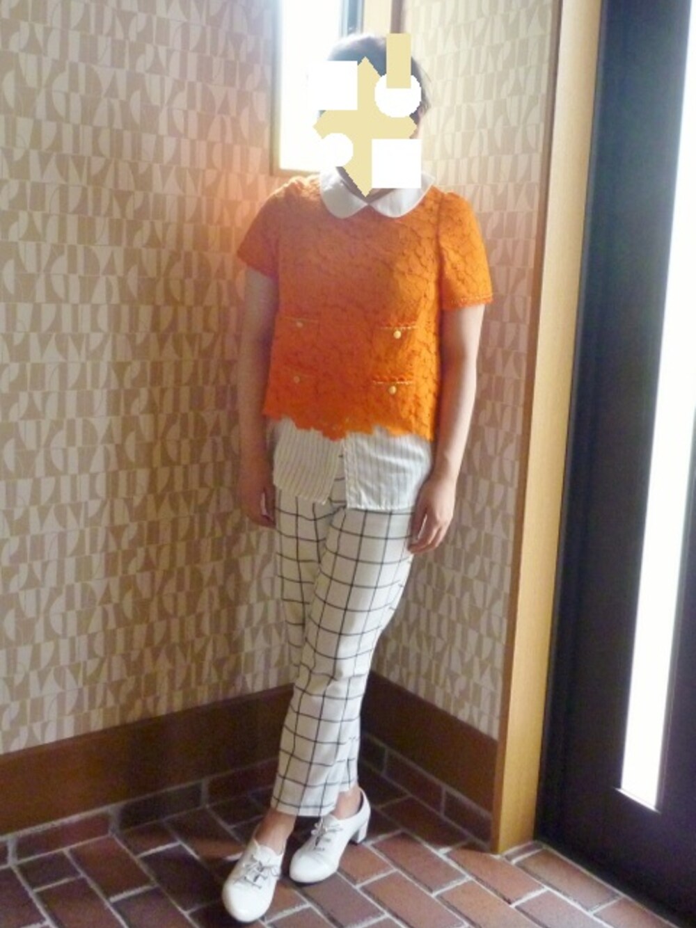 <オレンジ色ブラウス:コーデ1> オレンジ色のブラウス+白で 夏の爽やかコーデにまとめてみました。
