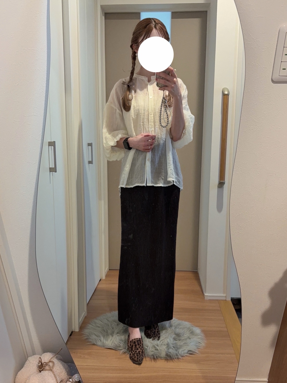 本日の出勤コーデはcocaランダムリブロングIラインスカート(26-230905001-06)を主役にしました🤎 カラー展開はbrown/Black/navy/wineの4色でサイズはS/M/Lの3サイズになっております✊🏻 wineが人気色だったので私もwineと迷いましたが今回はbrownのMサイズにしました🤭 フィット感があり、ストンとしたシルエットが美しいデザインですが生地に厚みがあり下着のラインが透けないのが嬉しいポイント✨ 他にはなかなか見ない、ランダムリブも周りと差がでて一気にオシャレさんに😳✨ ただ、店頭で出していてbrownとblack…とっても色が似ていて一瞬分かりません。笑 Dk.brownって感じでしょうか…笑🤔 でもそれはそれで黒系のお洋服も気軽に合わせても違和感ないのかな?と思ったのが実は購入理由です🤣笑 本日はそんな優秀アイテムと、cocaシアーボリュームブラウス+レオパードシューズでブラウン系のコーデを組みました🍂🤎 濃いbrownのリブスカートが、ほんのり透けてウエストの位置を目立たせてくれるので 一見ゆるっとしたスタイルですが女性らしいラインを見せてくれるコーデに🫶🏻