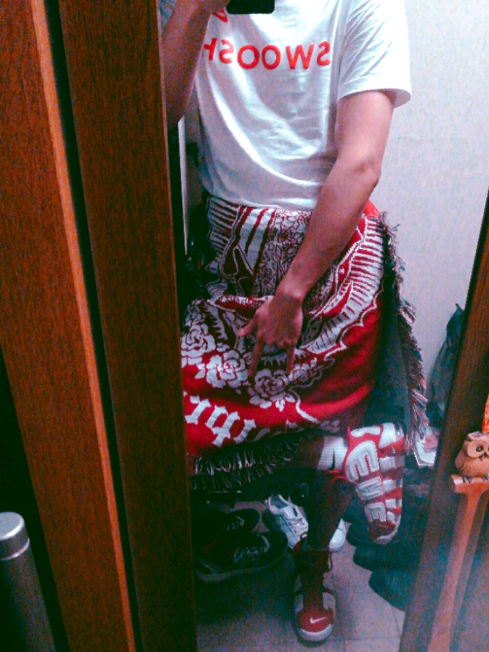 レッド系のスニーカーを着用したメンズの春コーディネートの1枚目の写真