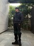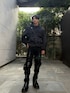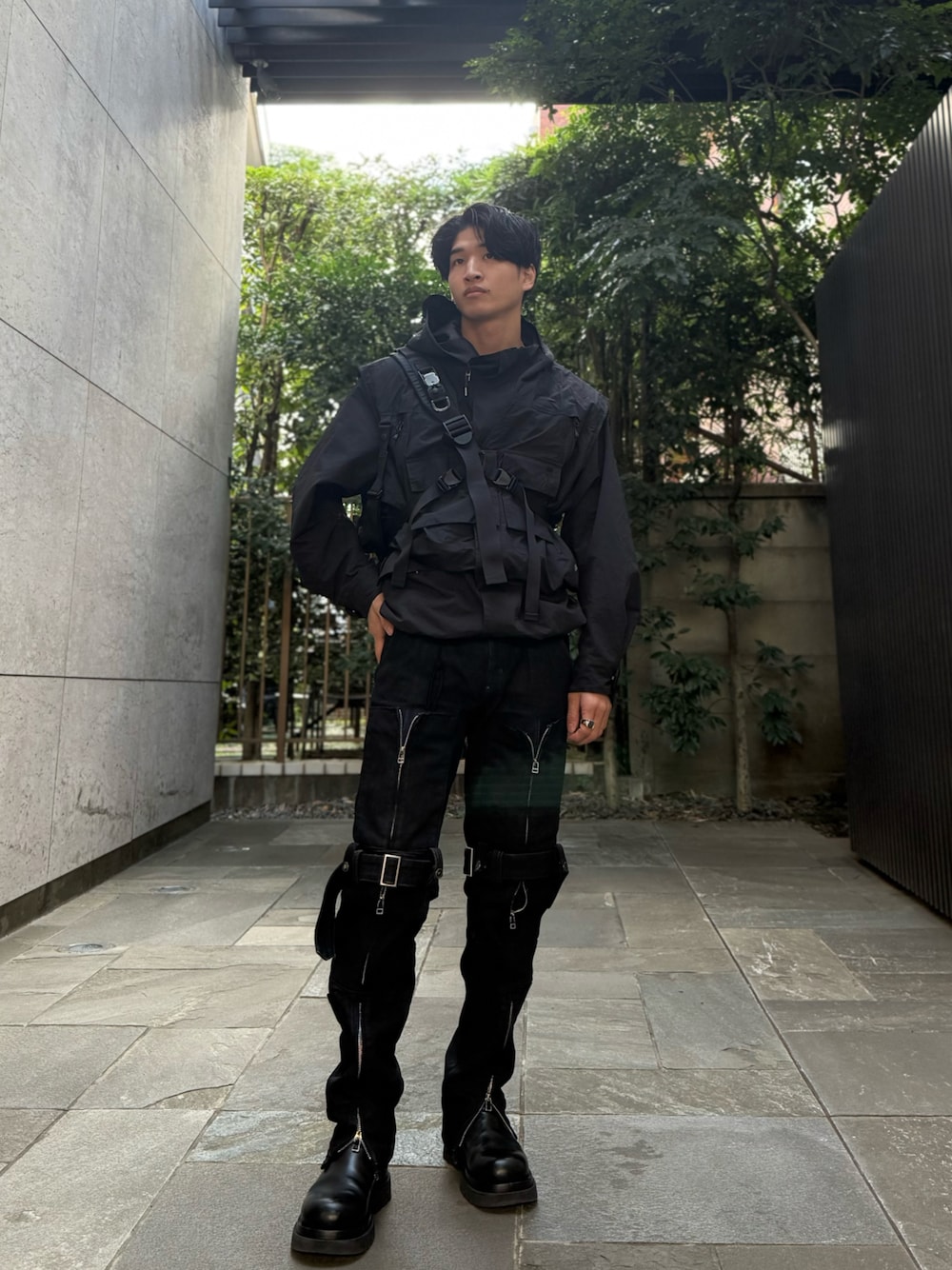 モードアイテムとテックアイテムを組み合わせてゴリゴリのコーデを組んでみました トップスでテックアイテム同士をレイヤードし、ボトムスのボンテージのディティールがレイヤード構造になっています。 ポイントは上下でレイヤードしてるところです。