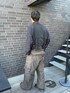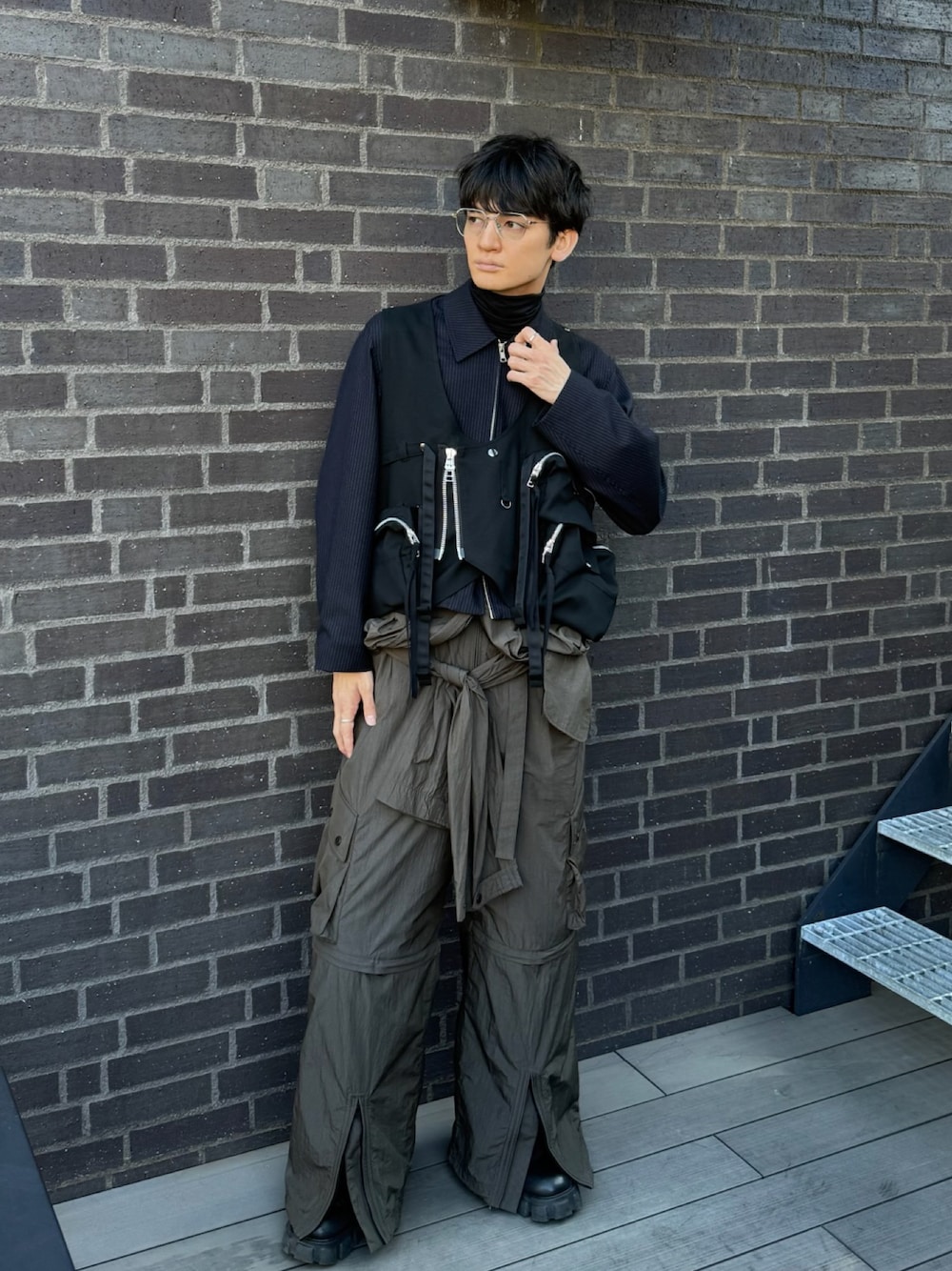 -カラー:NAVY×BROWN -シルエット:Aライン(ジャスト×ルーズ) 〈POINT📝〉 ・アイテム ミリタリーベースのアイテム(ベスト、ジャンプスーツ)ときれいめウールブルゾンの組み合わせ。ミックススタイルにすることでミリタリーの無骨感を中和し、着こなしに深みを出しています。ポケットや紐が特徴のベストのレイヤードや、ジャンプスーツを上まで着ず腰に巻くことで立体的で個性的なシルエットに。 ・色使い 青系と橙・茶系は補色(コントラストが強い組み合わせ)の関係ですが、ダークトーンのアイテムを選ぶことでコントラストを緩和してバランスを取っています。