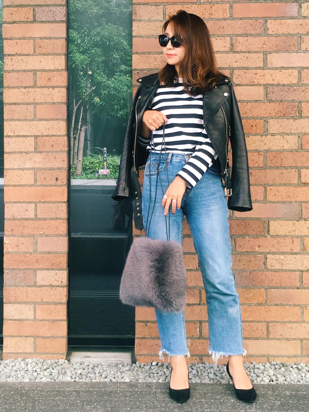 久しぶりすぎる#OOTD …♡ ボーダー✖︎デニムにライダース♡♡♡ 定番なので、新作のファーバッグで今年っぽく♡ instagram…moderobe_emi