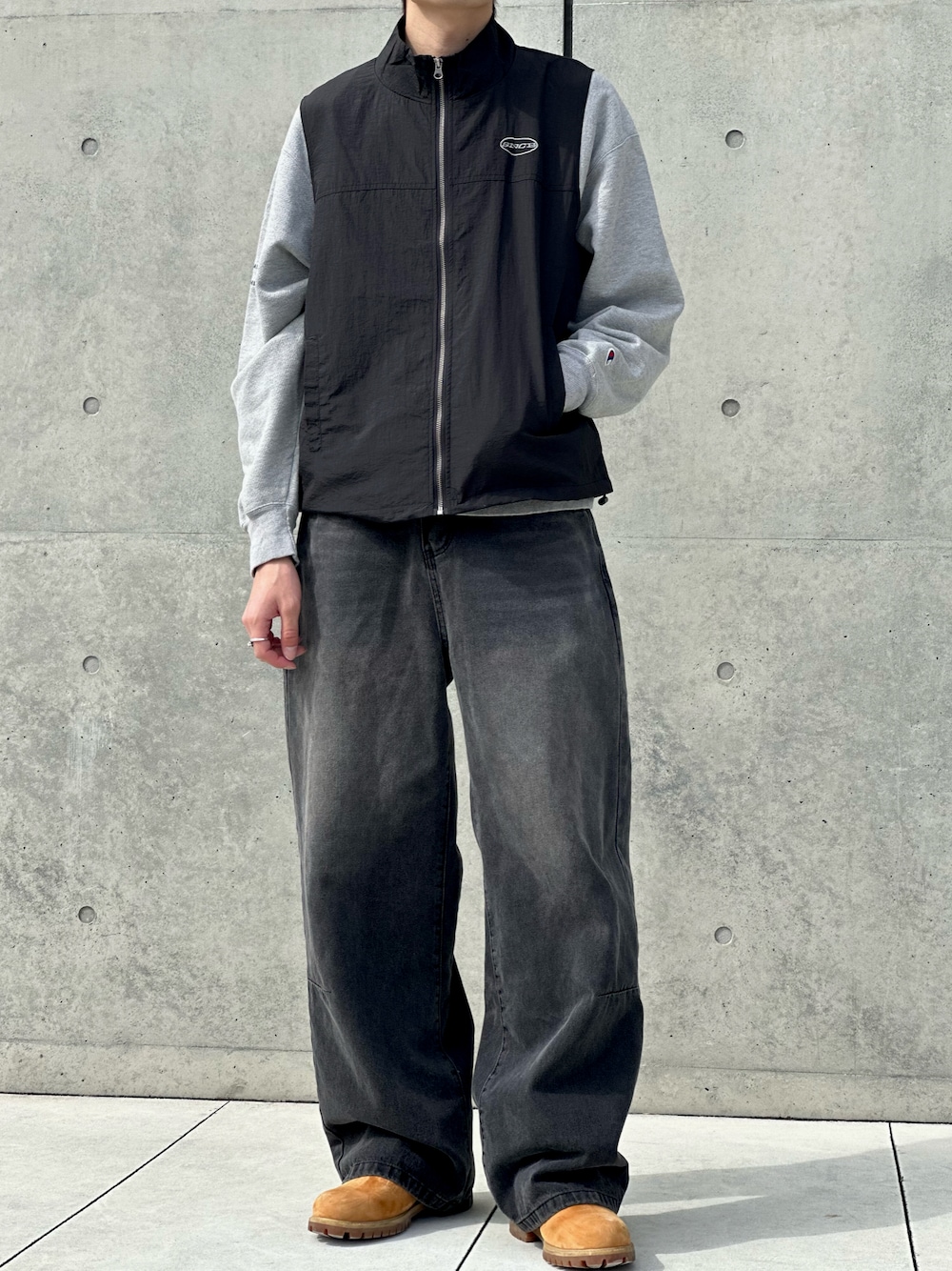 MODE SPACE 黒のストレートデニムを使ったストリートコーデ🔥 今流行りのワイドシルエットとブリーチ加工された色味が着回しやすくなっております! 足元はゴツめのワークシューズとも合うので気になる方は公式サイトをチェック✅