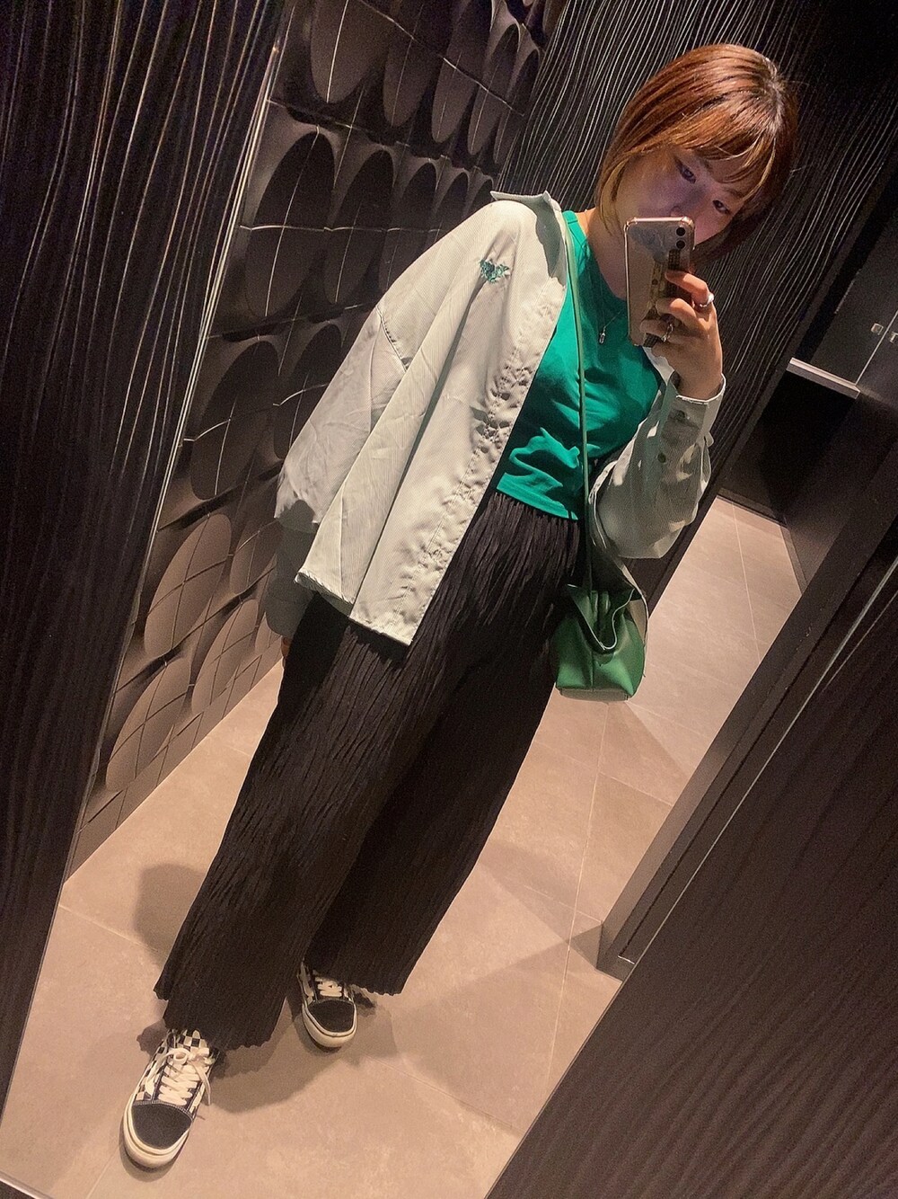 だいすきなグリーンコーデ🧚🧚 最近すきなyoungersongのシャツにSHEINのタンクトップ。 バッグもSHEINで大当たりだったやつ🎯 パンツはrandeboo スニーカーはVANS👟 知らない間に秋ですね😵💫😵💫😵💫