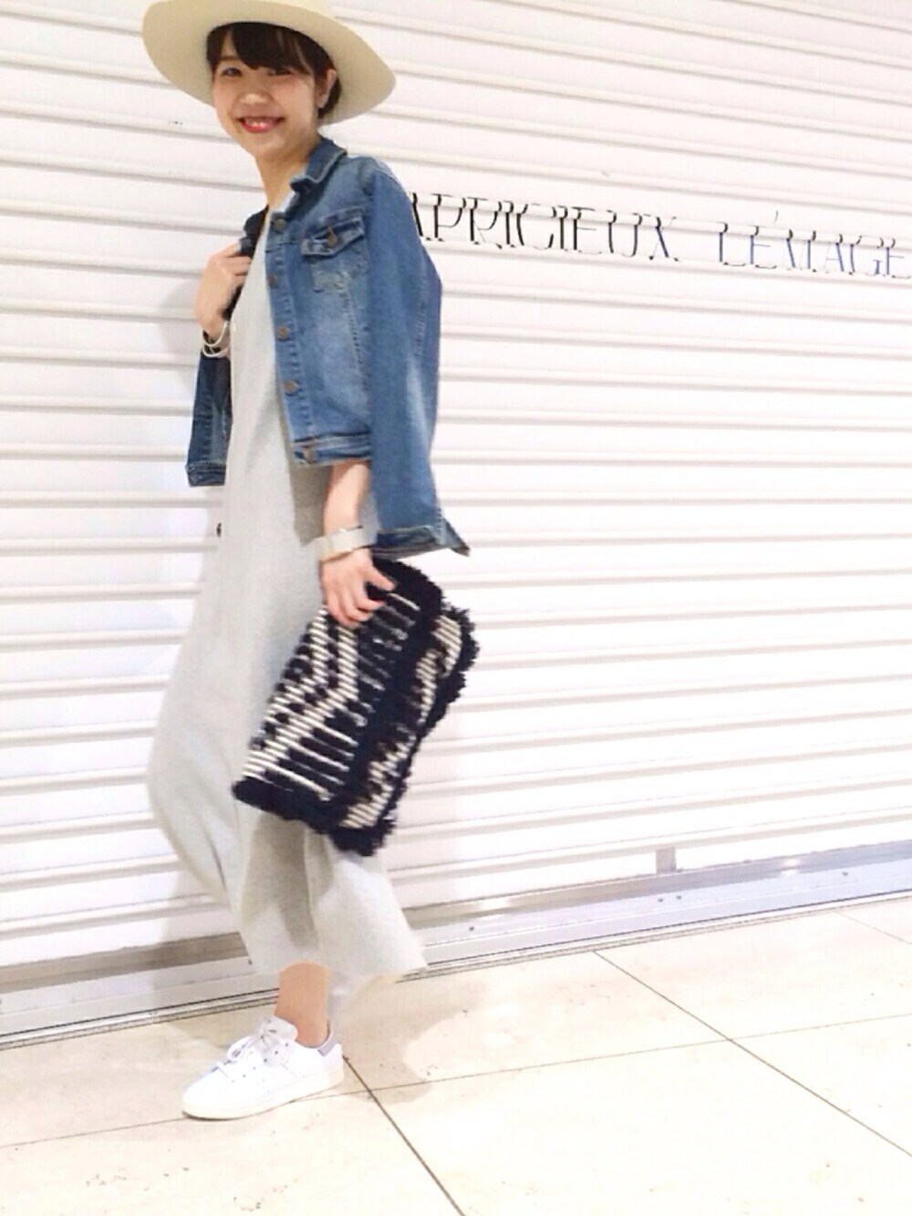 春に着たいニットワンピ🌷 Gジャンとスニーカーでカジュアルに。 アンクル丈ワンピはラインが出すぎず、Vネックですっきりとしたシルエット。 刺繍クラッチはシンプルなコーデのポイントにオススメです✨ インスタも見てください💓 @moe_lemage