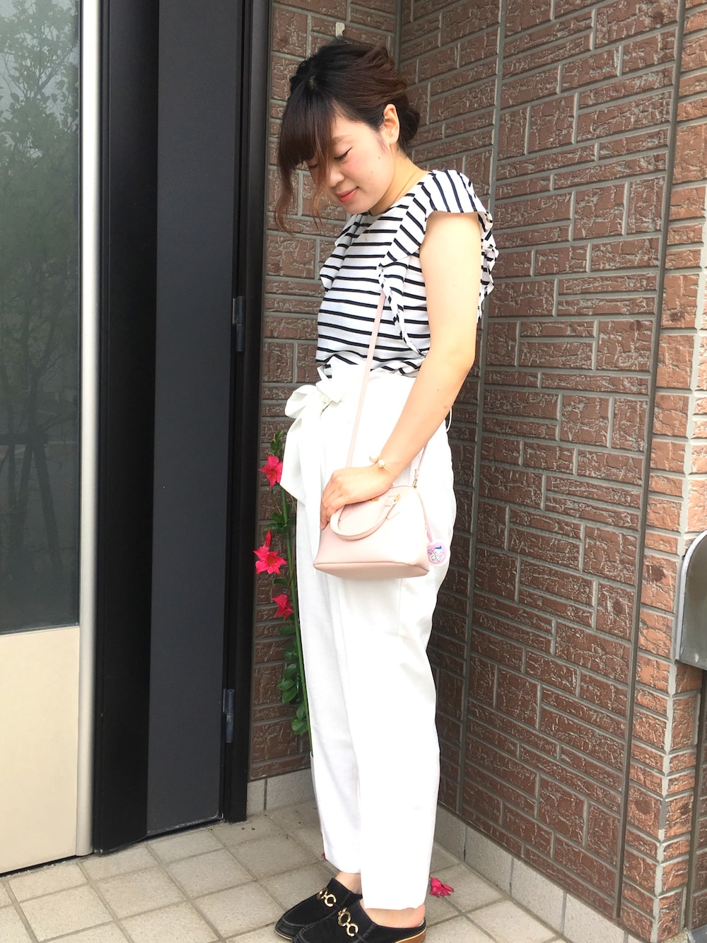 ドレス試着にいくので髪はアップにして 着替えしやすいゆったりした上下にしました! サボ 風のローファーサンダルは 2年前からヘビロテ中❤️ ナルシスのハイウエストパンツは季節問わずはけそうな素材です!