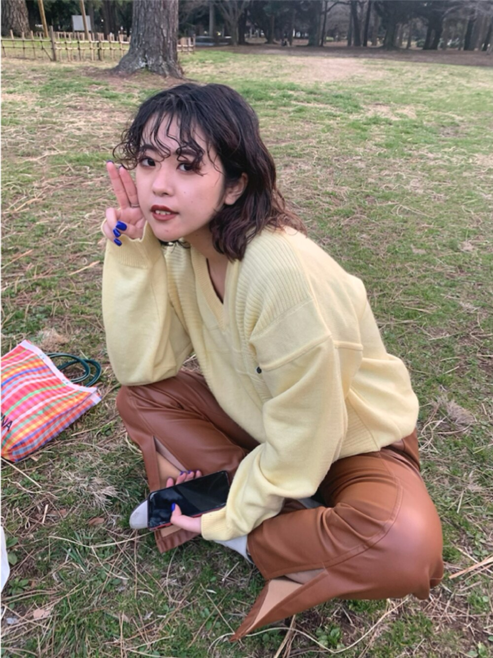 イエロー系のニット/セーター、ブラック系のパンツを着用したレディースの秋コーディネートの1枚目の写真