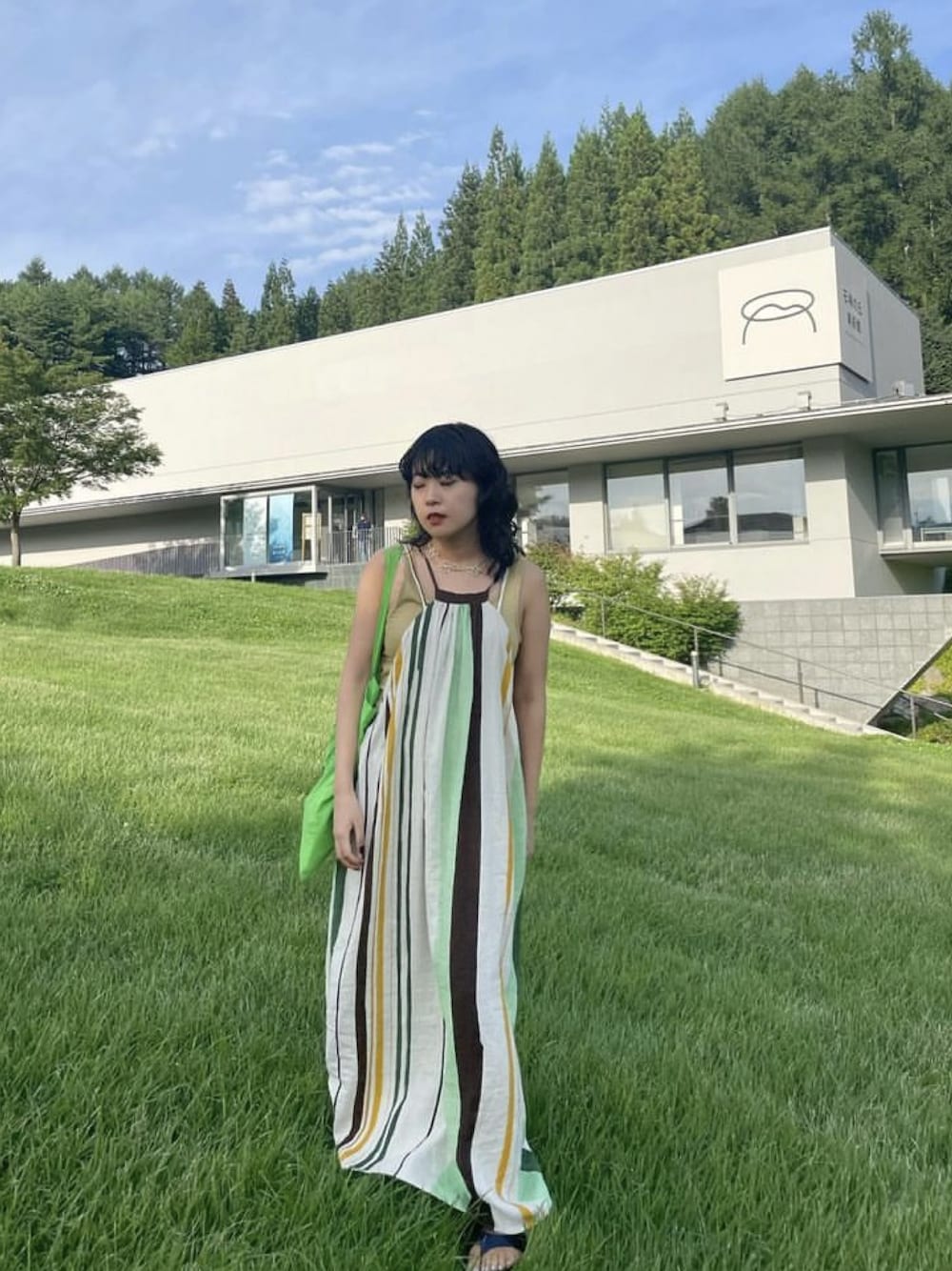 グリーン系のワンピース/ドレス、ブルー系のサンダルを着用したレディースの秋コーディネートの1枚目の写真