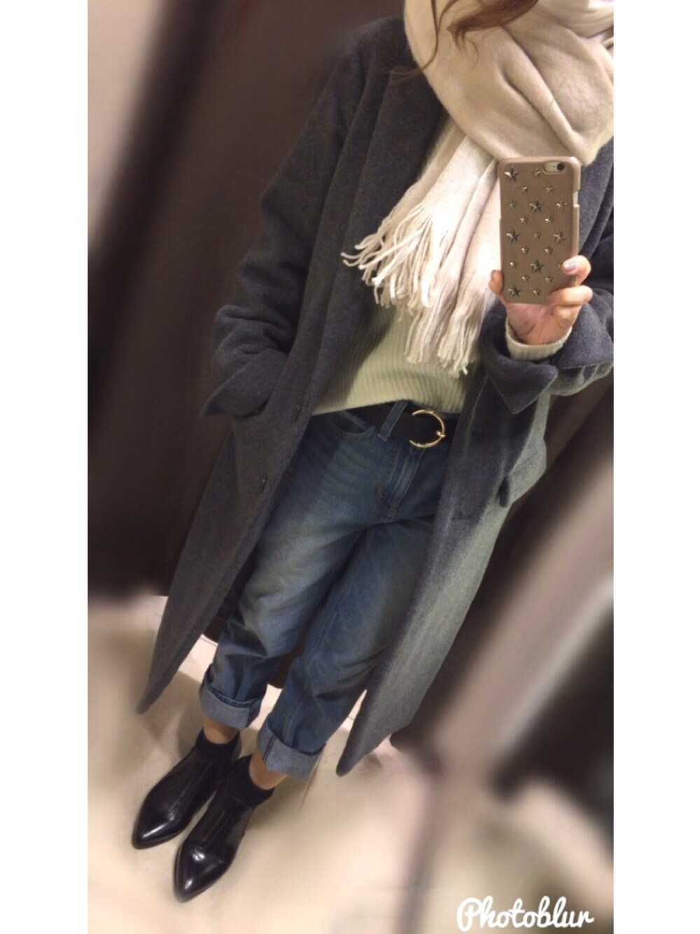 本格的に冬ですね😣💕 このコートはカシミアが入ってるので 中に厚手のニット着なくても 全然あったかい❤❤ 全体的にメンズライクなので マフラーの色はナチュラルカラーで👀