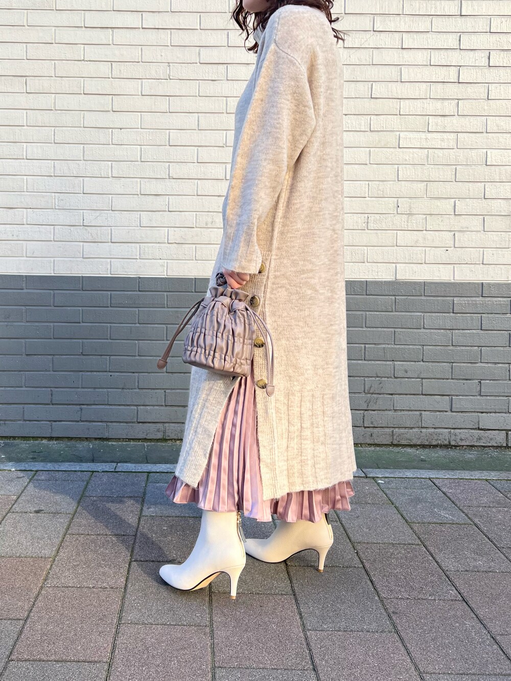 サイドボタンを開けたワンピースにプリーツスカートを合わせて大人かわいいコーディネートに😌