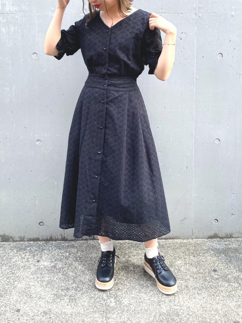 moeka(OLIVE des OLIVE 横浜ジョイナス)のワンピース「【新色追加!WEB限定】刺しゅうレースVネックワンピース」を使ったコーディネート