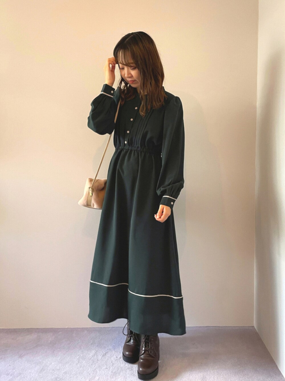 moeka(OLIVE des OLIVE 横浜ジョイナス)のワンピース「【人気アイテム再入荷】レトロなパイピングが映える!すずらん長袖ワンピース」を使ったコーディネート