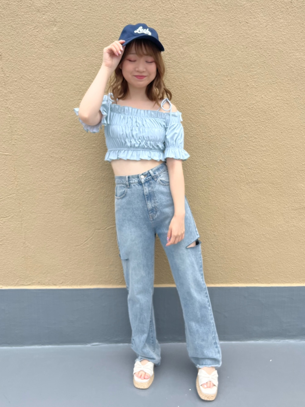 moeka(OLIVE des OLIVE 横浜ジョイナス)のデニムパンツ「ダメージワイドデニムパンツ」を使ったコーディネート