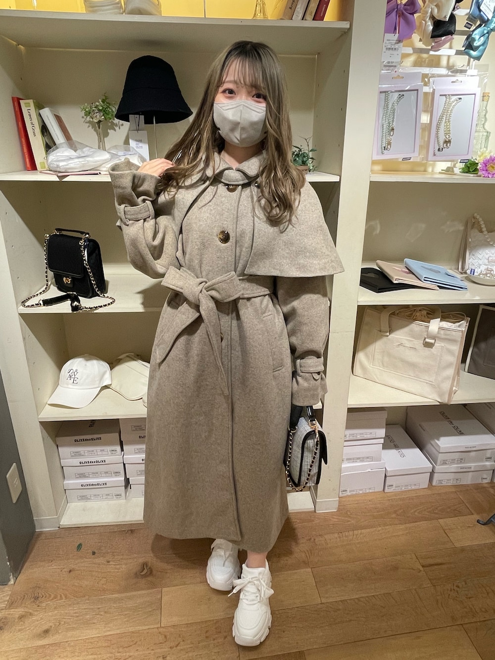 moeka(OLIVE des OLIVE 横浜ジョイナス)のステンカラーコート「【WEB限定/M・L展開】ケープ付きロングコート 1032080010」を使ったコーディネート