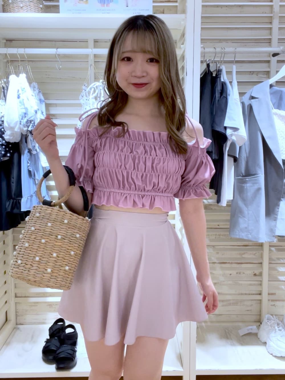 moeka(OLIVE des OLIVE 横浜ジョイナス)のかごバッグ「パール付雑材バッグ 1031120010」を使ったコーディネート