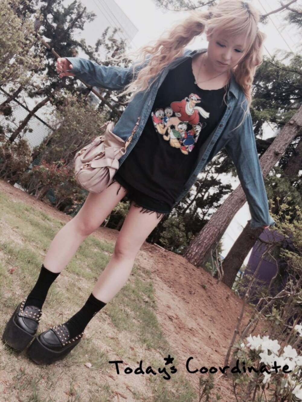 かわいいダックテイルズ(Lサイズ)のTシャツからチラっとショーパンを見せてセクシーすぎないヘルシースタイル♡ デニムシャツを軽く羽織って全身黒でも重たく見せずサマースタイル☆ ピンクのハイブランド小物を持つだけで女子力もUP♡ 遊園地、動物園等のアウトドアデートにピッタリです♡