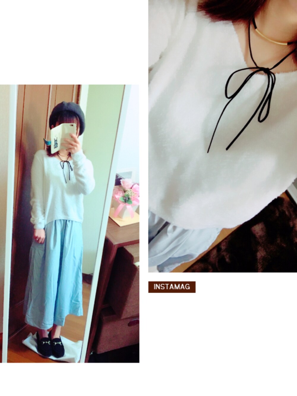 春先取り寒色系コーデです👏( ˘ω˘ ) 子供を連れてお出かけなので ペタンコの靴にワイドパンツ🙌 アイスブルーで春っぽくしました❤️ チョーカーはMUKで秋に買ったものでお気に入りです( *´꒳`*)💕