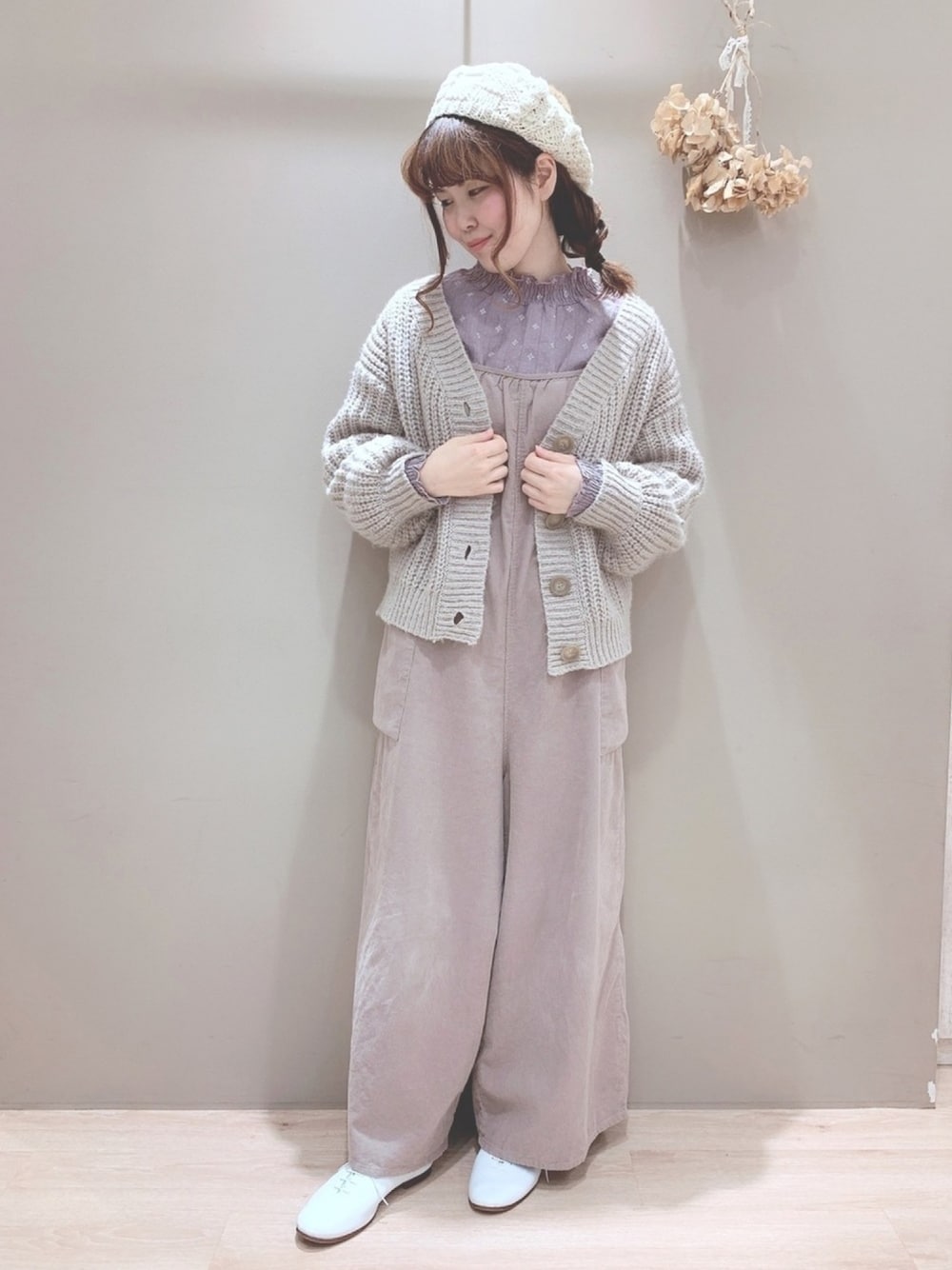 出勤コーデ☺︎ ゆるっとワントーンコーデং 前回投稿のサロペットを 少しガーリーに❃ カーディガンは少し短めの丈感 なので、スッキリ着られます✨ スカートやワイドパンツにも◎ ブラウスは少しラベンダーっぽい 色味が可愛い♡ 大好きな色です🥺