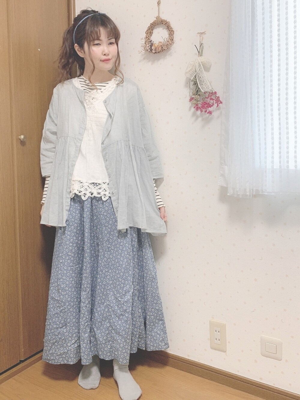 おはようございます🌱 爽やかなカラーでまとめた ゆるっとコーデです🐳 ムラ染めのブラウスは 薄手なので夏もサラッと 着られて、羽織に◎ レースアイテムを プラスして ガーリーに♡