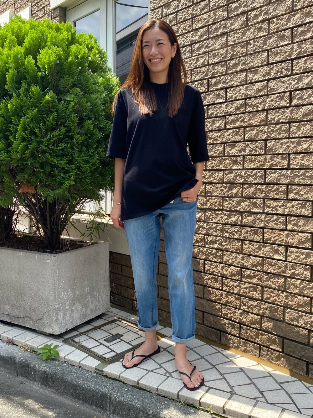 夏のカジュアルスタイル。カットソーは男女問わずユニセックスに着まわせる夏定番のTシャツです。家族でシェアしたり、お友達とお揃いで楽しんでいただけます。テーパードデニムに合わせてラフなスタイリングにしました。