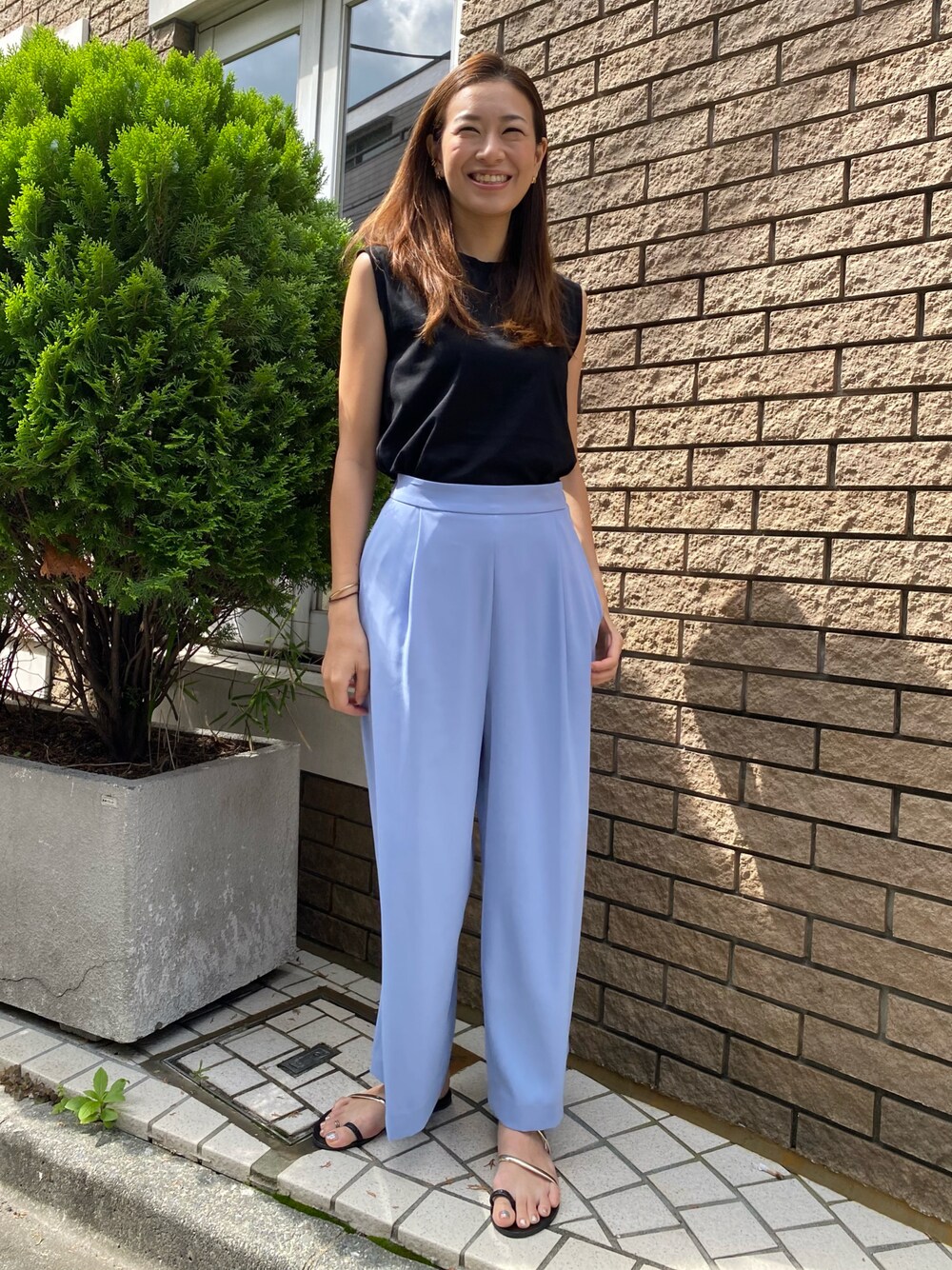 ベーシックなノースリーブカットソーにワイドパンツを合わせました。柔らかなタッチで着心地抜群です。丈が長すぎないのでフラットシューズとの相性がいいのもポイント。