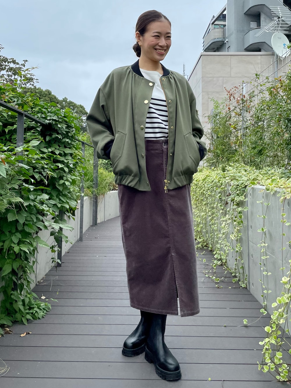 秋のカジュアルコーディネート。ボーダーカットソーに季節を感じるコーデュロイスカートを合わせました。気温が下りはじめたこの時期、軽くてコンパクトなブルゾンはおすすめです。裏地がストライプ、ピンクのグログランでチラッと見えた時までお洒落で遊び心と女性らしさが詰まったおすすめアイテムです。