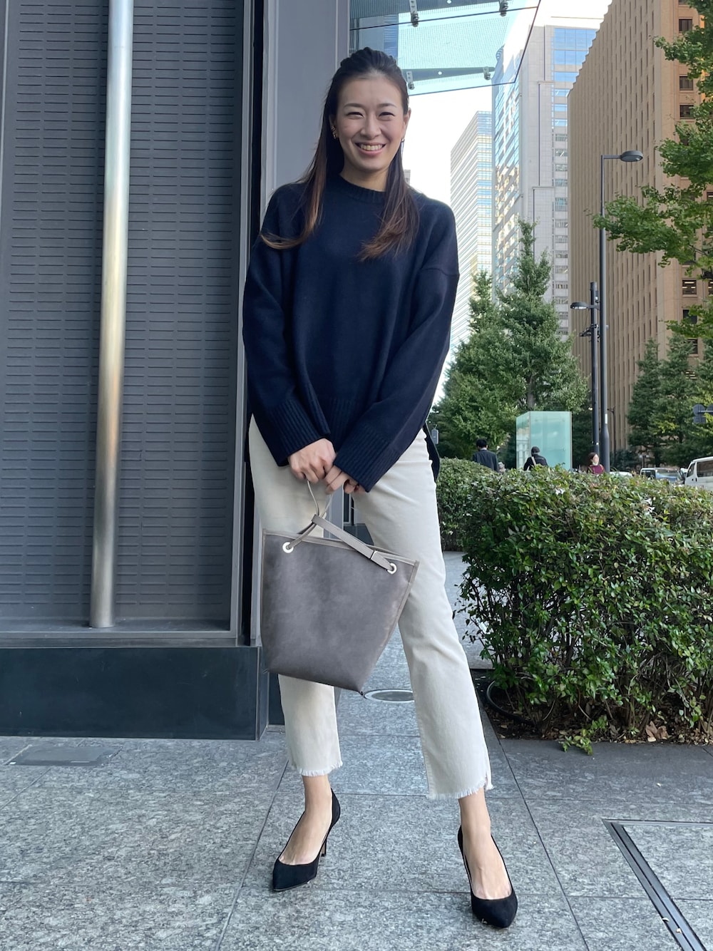 クルーネックニットはウールとカシミヤをミックスした素材で軽くて暖かいです。着膨れして見えないのも嬉しいポイントで、これからのシーズン着回し抜群のニットです。コーデュロイパンツに合わせてスッキリしたコーディネートにしました。