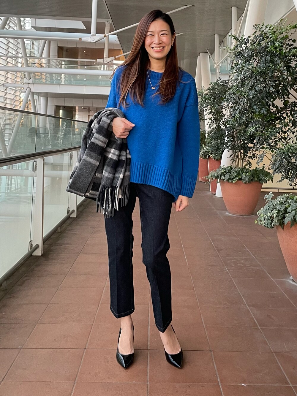 きれいなブルーが目を惹くニットにフレアシルエットのデニムを合わせました。センタープレスの入ったデニムはカジュアル過ぎず、綺麗目な印象で履いて頂けるので、お出かけにもおすすめの一本です。