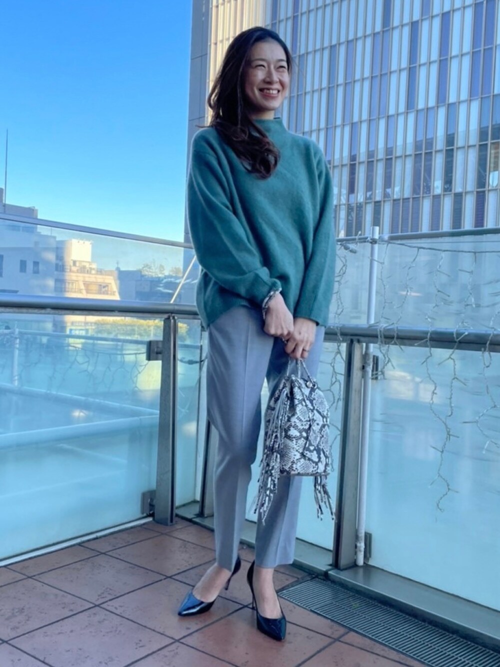 チャイニーズラクーンを使用した毛足の長いニットは、暖かさと軽い着心地が魅力の1枚。くすみグリーンが柔らかい印象を出してくれます。