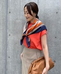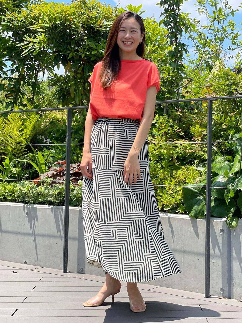 夏の休日スタイリング。鮮やかなオレンジ×幾何学柄のスカートで目を惹くコーディネートは元気が出ます。