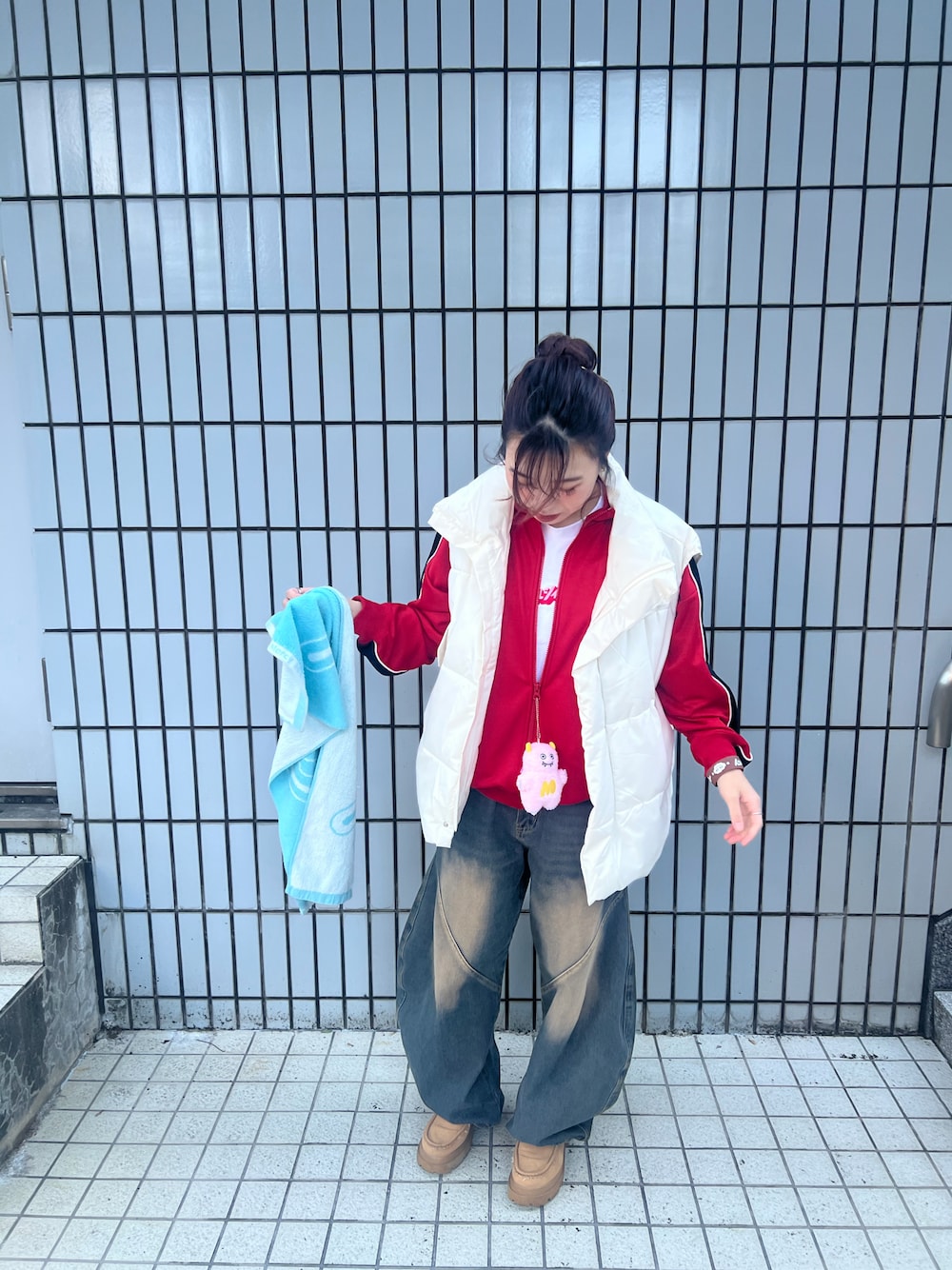 ジーンズとダウンベストをお揃いにした ジャージコーデで彼氏とシミラールックの参戦服^^