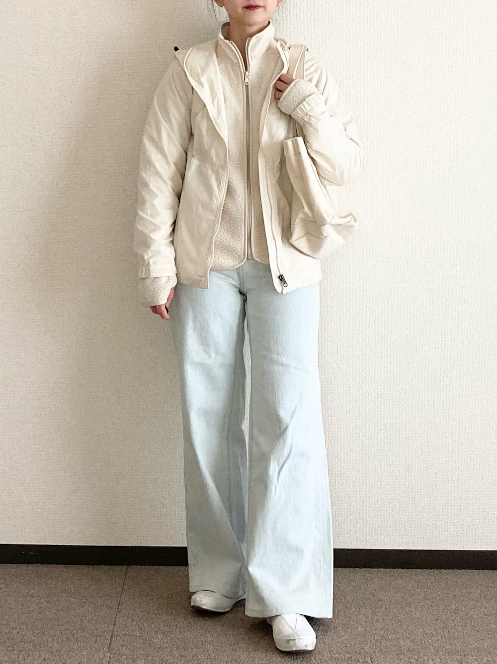 アウトドアジャケット×デニムの淡色コーデ🌟 サムポケットのあるフリースかわいい🥳