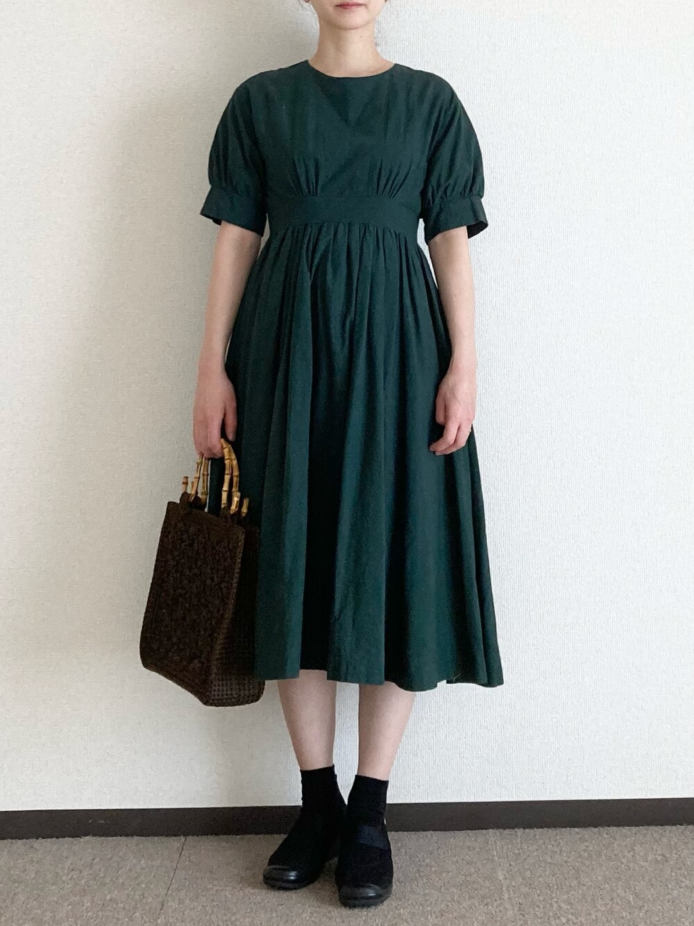緑のワンピースと編みバッグ🌟 ワンピースはハンドメイド✂️ 好きな要素を詰め込みました💓 形が可愛いのでカラーは暗めで😌