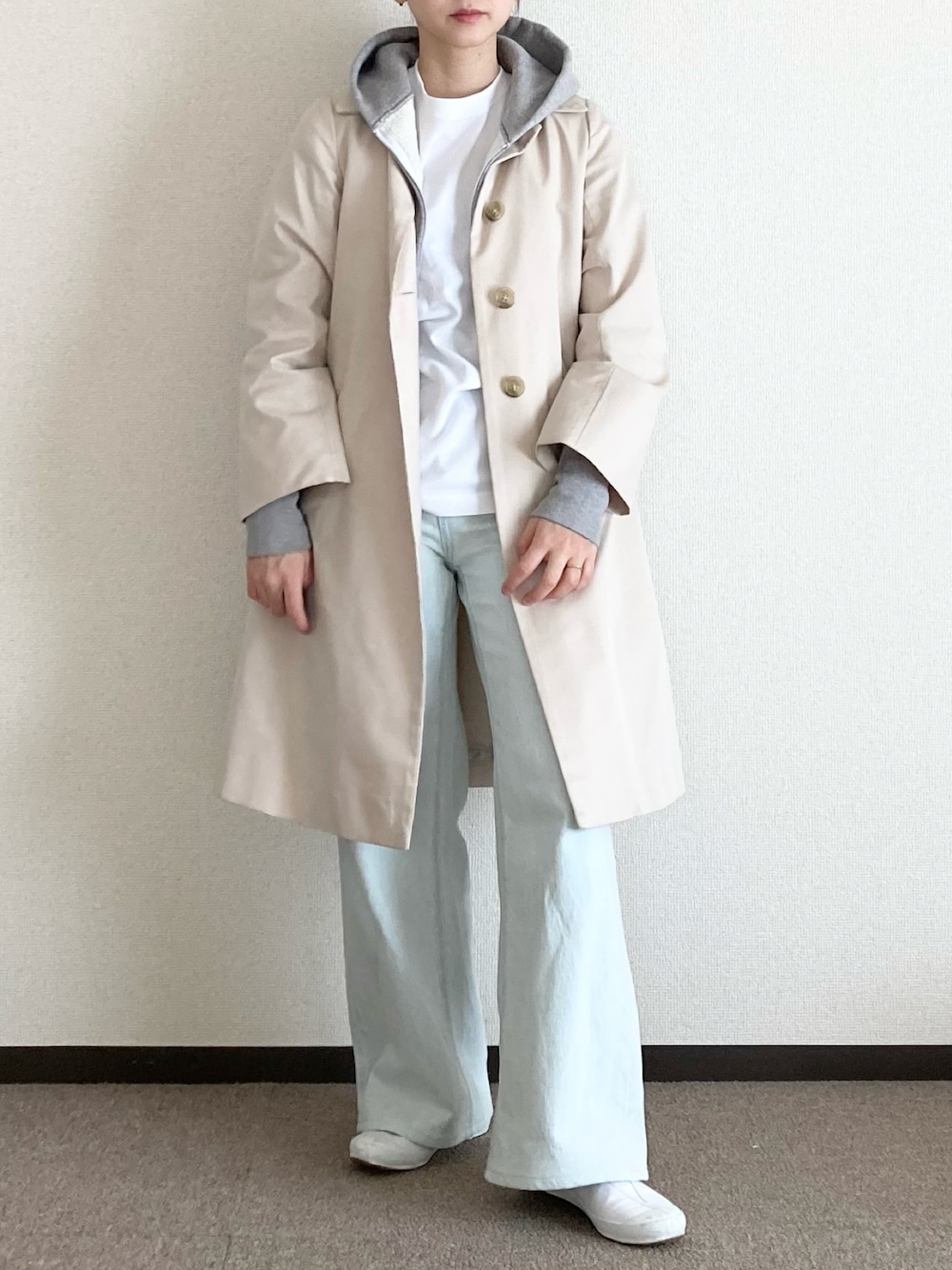 ステンカラーコート×パーカー×デニム🌸 寒いので重ね着で着回しコーデ😌